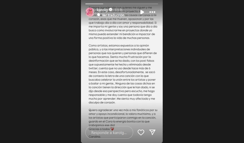 En su mensaje en Instagram, Karol G también dijo sentir "mucha frustración por la desinformación que se ha dado", después de que circulara un mensaje escrito en su cuenta de X en el que supuestamente hacía referencia a esta polémica y que después fue eliminado, algo que nunca pasó, según la artista, pues no utiliza esa red social desde hace seis meses.