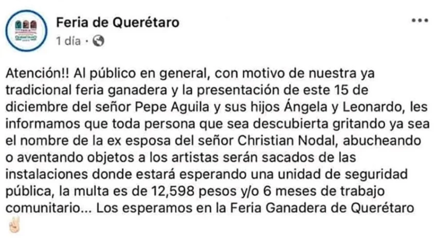 "Informamos que toda persona que sea descubierta gritando, ya sea el nombre de la exesposa del señor Christian Nodal, abucheando o aventando objetos a los artistas, será sacada de las instalaciones, donde estará esperando una unidad de seguridad pública. La multa es de 12 mil 598 pesos o 6 meses de trabajo comunitario", se lee en el supuesto comunicado.