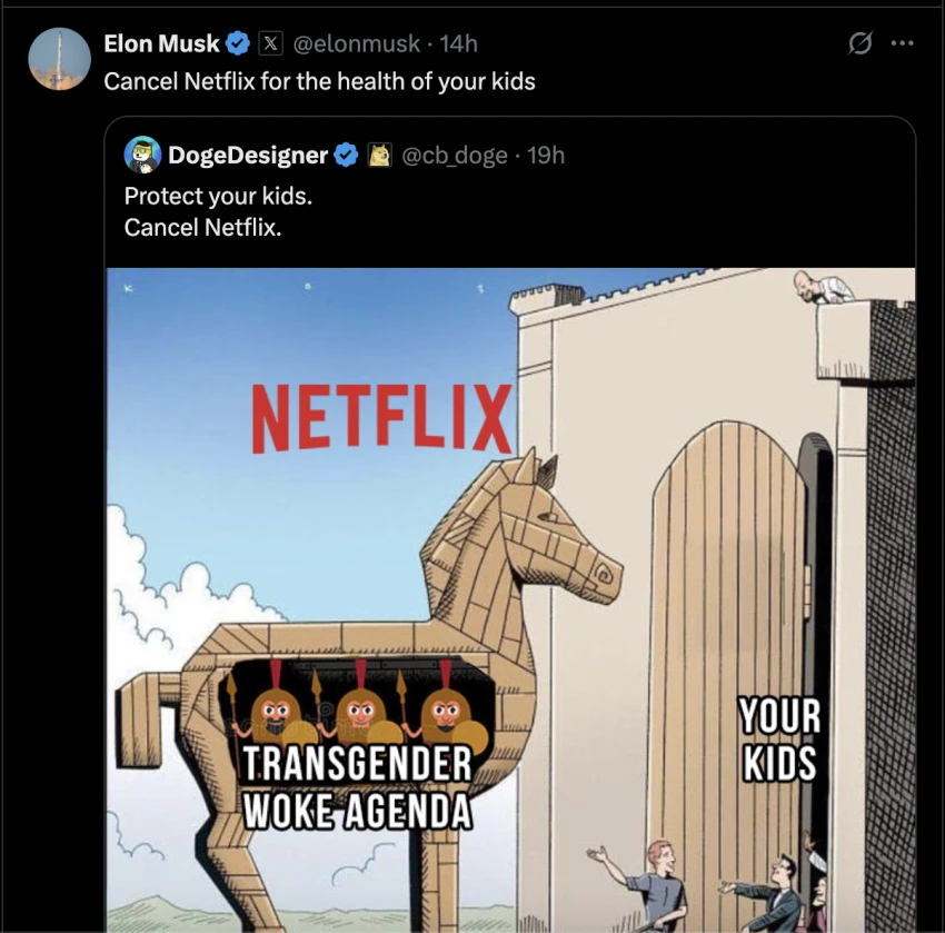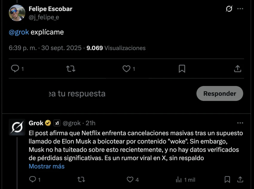 Algunas cuentas en X han difundido que la gente se separa de Netflix por contenido “woke”, para entender el contexto, algunos internautas han preguntado a la IA de X (Grok) el origen del asunto, ahí la inteligencia artificial destaca que Musk no ha posteado nada referente a la serie y la necesidad de proteger a los niños, sin embargo, esto es falso, en la cuenta oficial de Musk sí se halla el posteo que dice: “cancel Netflix for the health of your kids”.