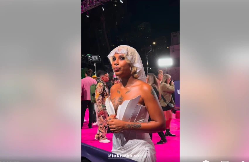 La dominicana Tokischa siguió con su tradición de incorporar el concepto de sus álbumes a su moda en las alfombras. La artista estaba vestida de novia, con un traje hecho a la medida, incluyendo un corto velo sobre una peluca rubia al estilo de Marilyn Monroe.