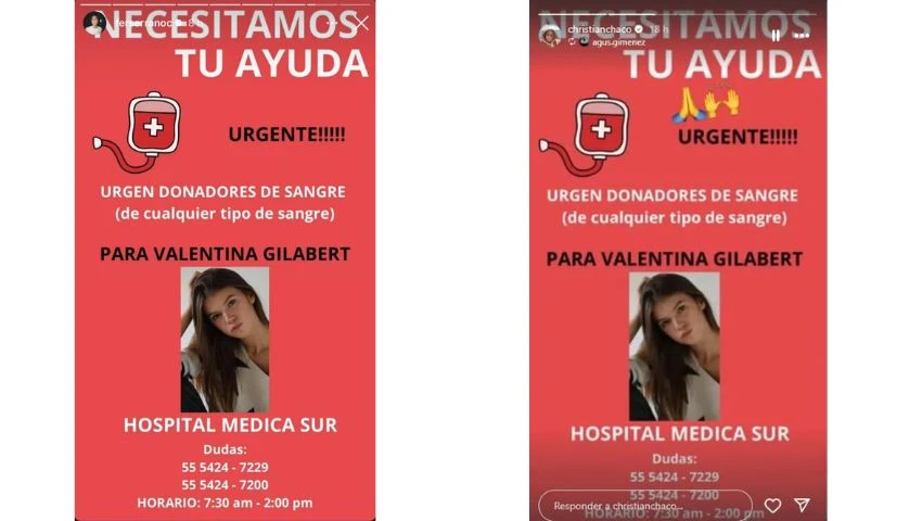 "¡Urgente! Necesitamos tu ayuda. Se requieren donadores de sangre para Valentina Gilabert en el Hospital Médica Sur", publicó Fernanda Serrano en su cuenta de Instagram.