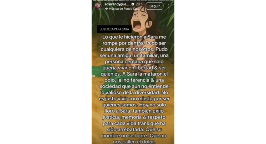 "No es justo vivir con miedo por ser quienes somos. Hoy no solo lloro por Sara, también exijo justicia, memoria y respeto para cada vida trans que ha sido arrebatada. Que su nombre no se borre. Que no nos callen su dolor", continúa la imagen compartida por Wendy Guevara.